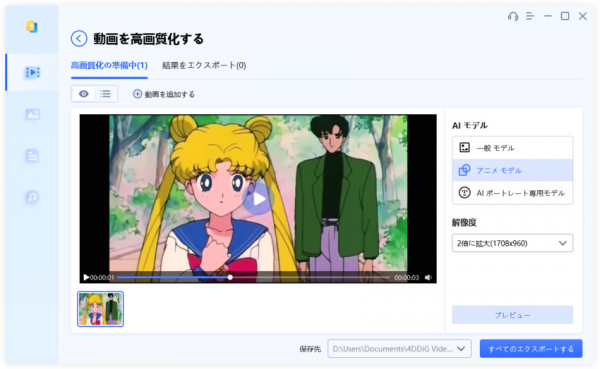 手順3:「プレビュー」ボタンをクリックすると高画質化前後の動画が比較して表示されるので、結果が良ければ「すべてのエクスポートする」をクリックして写真を保存します。