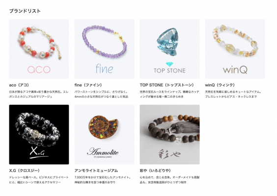 天然石・パワーストーンのラインナップは230種類以上。「一期一会の飾るで彩りを」をコンセプトに、十人十色のストーリーを提供するECサイトです。高品質な石を使ったブレスレットのオーダーメイドサービスをはじめ、天然石の歴史・文化を深掘りするコンテンツも好評を博しています。