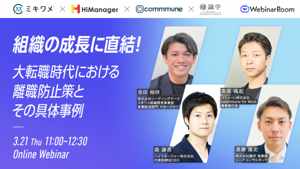 ビジネスマンの役に立つ動画がいつでも無料で観られるウェビナープラットフォーム「Webinar Room(ウェビナールーム)」(https://webinar-room.net/)を運営する株式会社ヒトクセは、2024年3月21日(木)11:00~に株式会社リーディングマーク、ハイマネージャー株式会社、コミューン株式会社、株式会社識学との” 組織の成長に直結!大転職時代における離職防止策とその具体事例”を開催します。