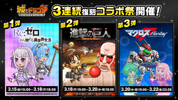 3月15日(金)より、「3連続復刻コラボ祭」として第1弾はTVアニメ『Re:ゼロから始める異世界生活』、第2弾はTVアニメ『進撃の巨人』、第3弾はアニメ『マクロスF(フロンティア)』との復刻コラボイベントを開催することが決定いたしました。さらに3月8日(金)からは「コラボ直前!わくわくリポストキャンペーン」をSNSにて実施いたします。ぜひこの機会をお見逃しなく!