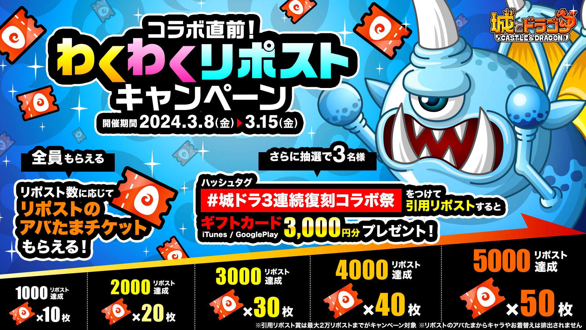 各コラボ開催を記念して、「コラボ直前!わくわくリポストキャンペーン」を実施いたします。『城とドラゴン』公式X(旧Twitter)アカウント(@shirotodoragon)が投稿したキャンペーン対象ポストの公式リポスト総数に応じて、いろいろなゲーム内アイテムが当たる「リポストのアバたま」の専用チケット「リポストのアバたまチケット」をユーザー全員にプレゼント!