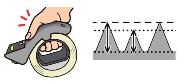 しっかり握れる立体カーブ形状ハンドル、切断タイミングを分けることで快適な切れ味を実現した長短2段刃、シリコンの非粘着特性を活用したテープの引き出しや交換がスムーズに行えるシリコンローラー、安定した握り心地でテープを引き出せるサポートローラーなど、多くの機能を搭載。これらの「グッと握って、ズバッと切れる」設計により、快適な梱包作業を実現します。