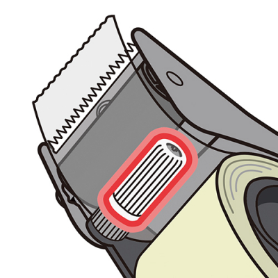 テープセット時の煩わしさも「シリコンローラー」が解消。テープが貼り付きにくいだけでなく、ローラーの長さがテープ幅※よりも短いため、テープ先端を経路にスッと通しやすく、簡単にセットできます。