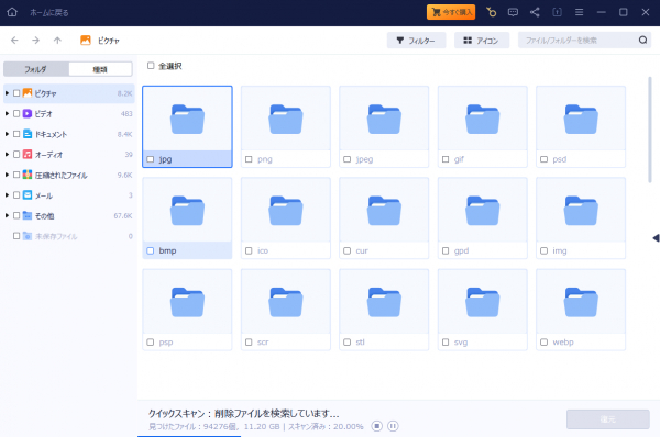 Step 2.削除されたデータを素早くスキャンします。削除したデータへのクイックスキャンが終わると、すぐハードディスク全体へのディープスキャンが始まります。この段階のスキャンによって紛失データを更に多く検出することが可能です。