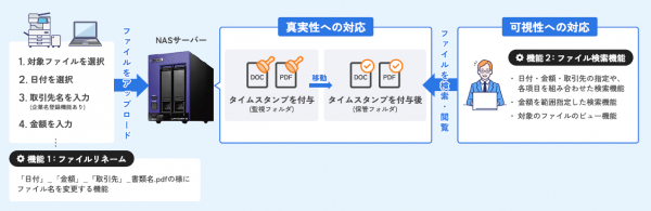 「セイコー ストレージサービス」は、大容量データの保管が可能なNASサーバー(NAS:Network Attached Storage)と総務大臣認定のセイコータイムスタンプサービス(5年分)・ファイル管理ソフトウェアがセットになっており、「クラウド利用が難しい」「手元にデータを残したい」「データは自分で管理するので、手軽に安価に実現したい」といった要望を持つ中小規模の事業者向けのサービスです。NASサーバーにデータをアップロードすると、自動でタイムスタンプを押印し、長期に亘りデータを保存しておく事が可能です。データ容量は2TB(300万を超えるPDFファイル)の保存領域を有しており、契約期間の5年経過後に、再契約にて新しいNASサーバーに交換することにより、法人の書類保存期間7年間に対応します。簡単な機器設置のみで、電子帳簿保存法が求めるデータ保存の要件を満たし、大容量データ保管とデータへのリモートアクセスを可能にします。