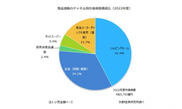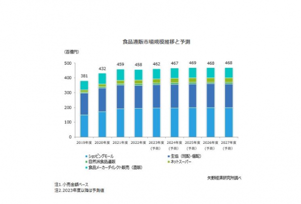 今後の食品通販市場は成長の鈍化を予測する。商品の値上げによる販売金額の上乗せもあり、2023年度の市場規模は前年度比1.0%増の4兆6,200億円と予測するが、市場全体を牽引してきたショッピングモール(ECモール、カタログ通販も含む)は成長率が鈍化するとみる。これは配送料を含めた販売価格が上昇することで、節約の観点で価格を重視する消費者の一部需要が、通販やWebから実店舗に流出することが考えられるほか、プラットフォーム側も収益性を重視して、販促施策の方針転換や配送料優遇ラインの引き上げなど、サービス内容の見直しを図る動きが加速するとみられるためである。