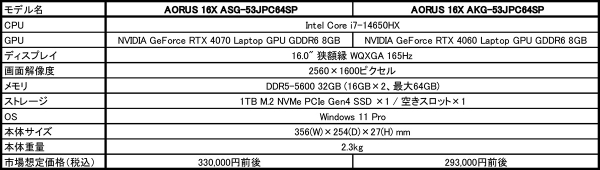 両製品とも、CPUには最新のモバイル版第14世代Intel Core i7-14650HXプロセッサ(Turbo Boost時最大5.2GHz)を採用しました。GPUには、AORUS 16X ASG-53JPC64SPがNVIDIA GeForce RTX 4070 Laptop GPU GDDR6 8GB(最大ブーストクロック2175MHz、最大消費電力140W)、AORUS 16X AKG-53JPC64SPがNVIDIA GeForce RTX 4060 Laptop GPU GDDR6 8GB(最大ブーストクロック2370MHz、最大消費電力140W)をそれぞれ搭載しています。