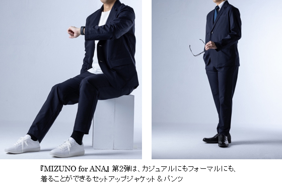 『MIZUNO for ANA』は、日本を代表するスポーツブランドミズノとANAのコラボレーションモデルです。2023年10月の発売に続く第2弾では、通気性の高さが特長のミズノが持つ機能性素材“エアリーベント”を活かしたセットアップのジャケットとパンツを販売します。