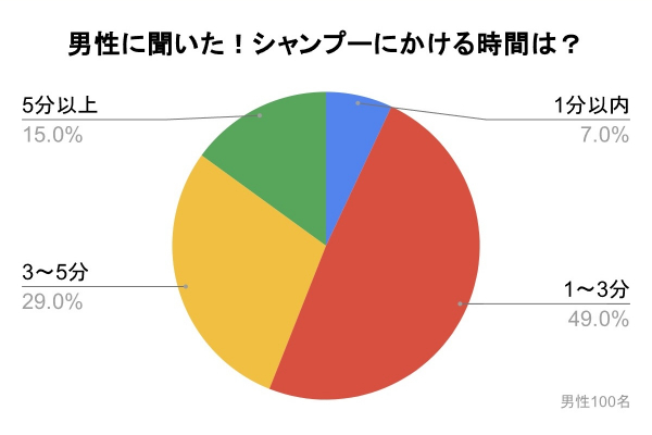 「シャンプーにかける時間を教えてください」のアンケート調査を行ったところ、『1分以内』が7%、『1分~3分』が49%、『3分~5分』が29%、『5分以上』が15%となり、半数以上の男性はシャンプーにかける時間が3分以内であることがわかりました。