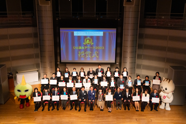 今年は、全国から607件(行政:173件、企業375件、民間団体59件)の取組が寄せられ、実行委員会での審査の結果、最優秀賞20団体、優秀賞19団体、優良賞19団体、合計58団体の受賞を決定しました。(受賞団体一覧:https://www.hitosuzumi.jp/media/pdf/award2023.pdf)