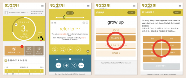 これまで旺文社刊行の英単語集「英単語ターゲット」・「英検(R) でる順パス単」シリーズのコンテンツに対応し、単語力の向上をサポートしてきましたが、今回要望の多かった『英熟語ターゲット1000 5訂版』に対応したことで、「タンゴスタ!」を英熟語や英語構文の学習にもご利用いただけるようになりました。