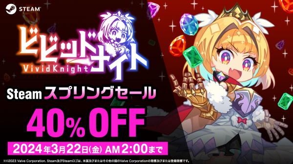 Steamにて開催される、“Steam スプリングセール”に、パーティ構築型ローグライクゲーム『ビビッドナイト』が登場!日本時間の3月15日(金)より40%オフとなります。国内外で人気を博した本作をこの機会にぜひプレイしてみてください!
