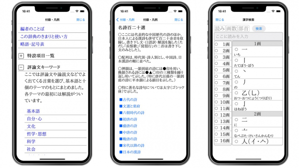 アプリのみのオリジナルコンテンツ「名詩百二十選」「日本漢詩文に登場する地名」も収録。書き下し文、日本語訳、解説付きで楽しみながら漢詩の学習ができます。