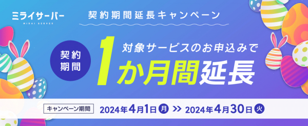 ミライサーバー(運営会社:アシストアップ株式会社、所在地:大阪府大阪市、代表取締役:青木 勝彦)は、2024年4月1日(月)~2024年4月30日(火)の期間、契約期間延長キャンペーンを実施いたします。