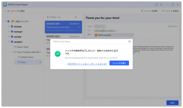 修復されたメールファイルをプレビューし、保存するパスを選択します。
