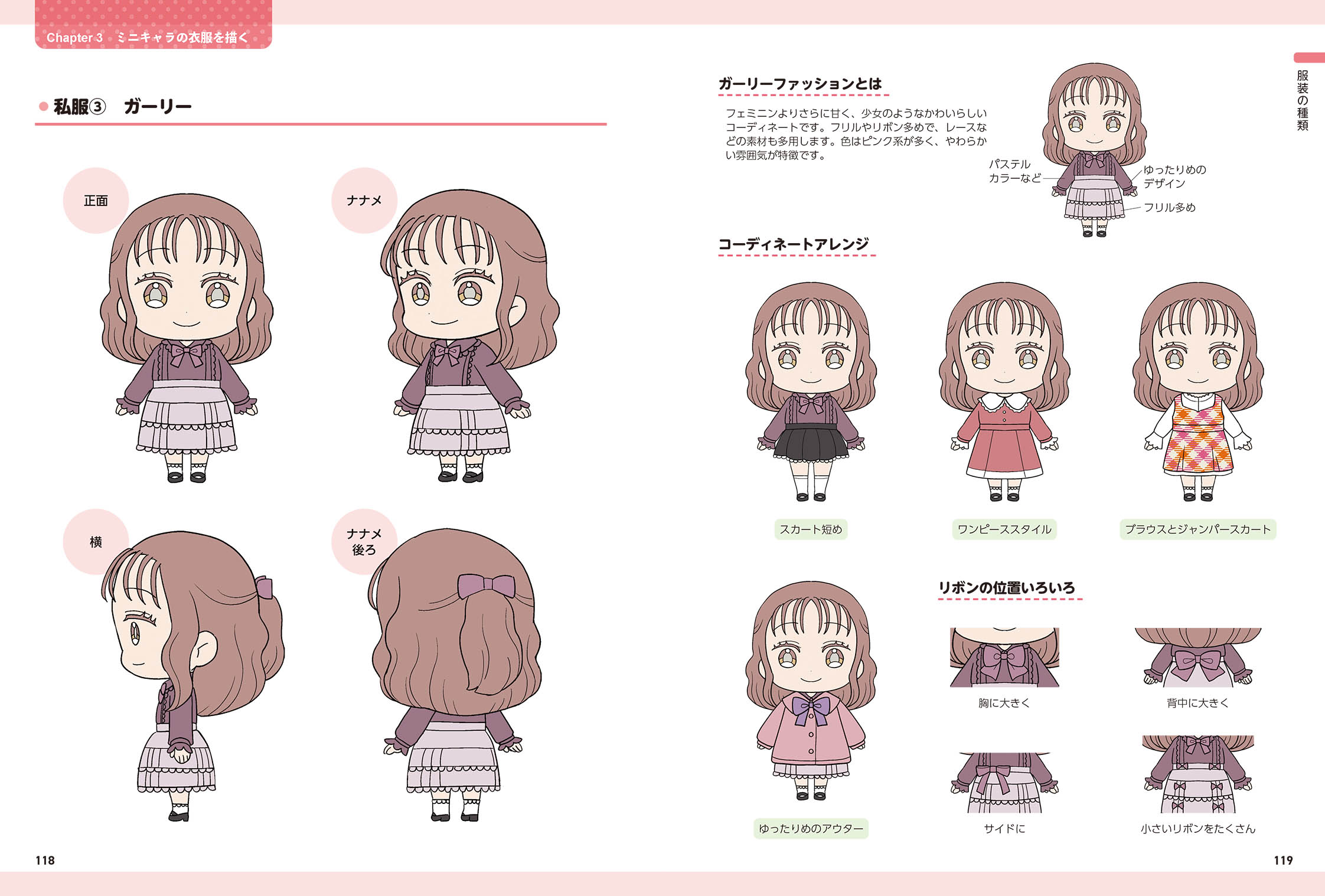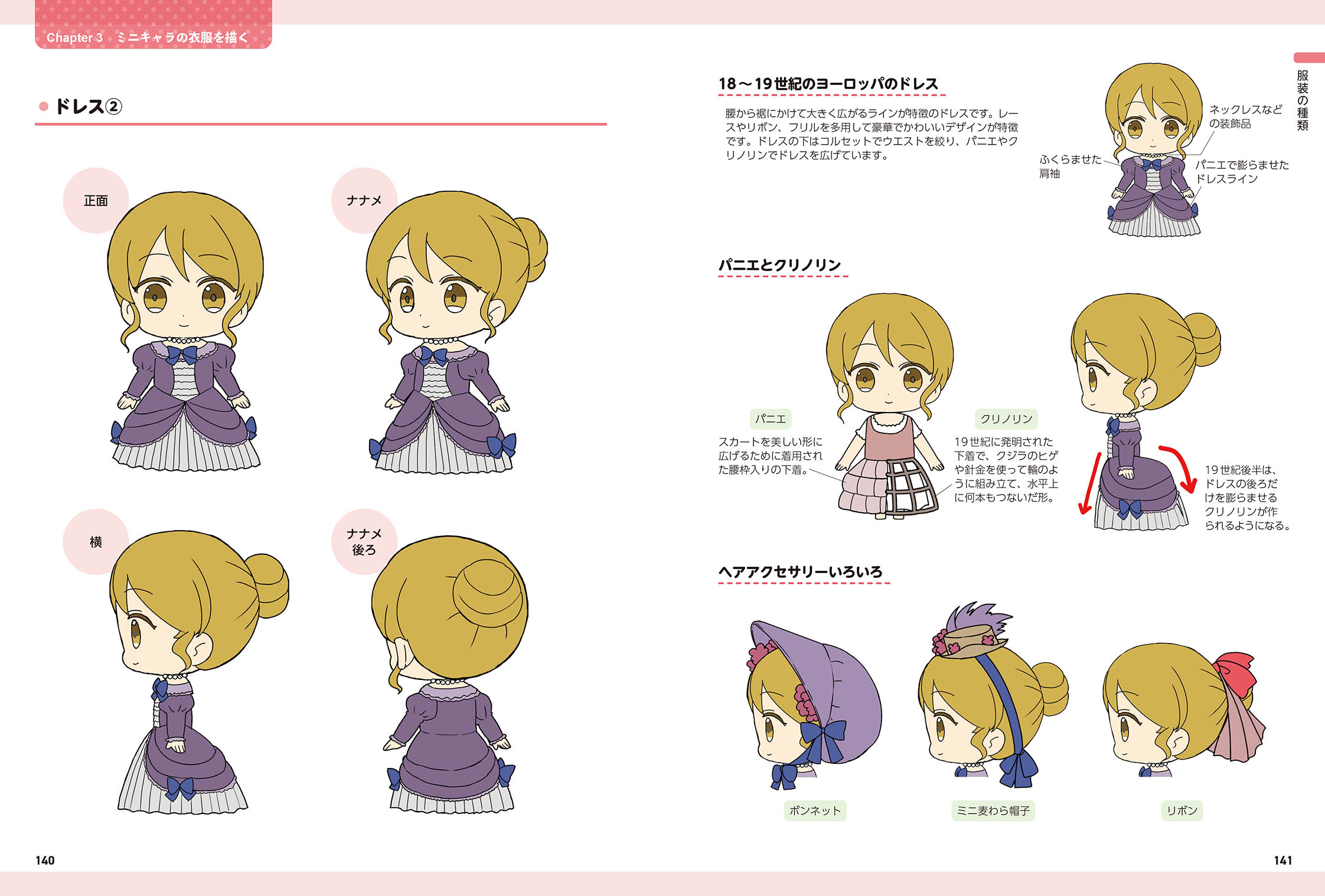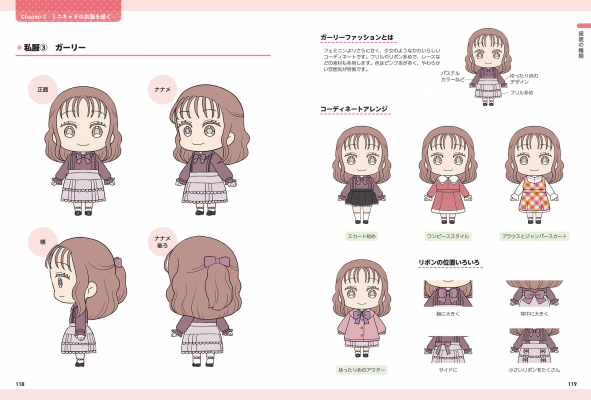 本書では、ミニキャラの髪型や衣服に注目し、いろいろな種類のヘアスタイルやファッションを収録しています。