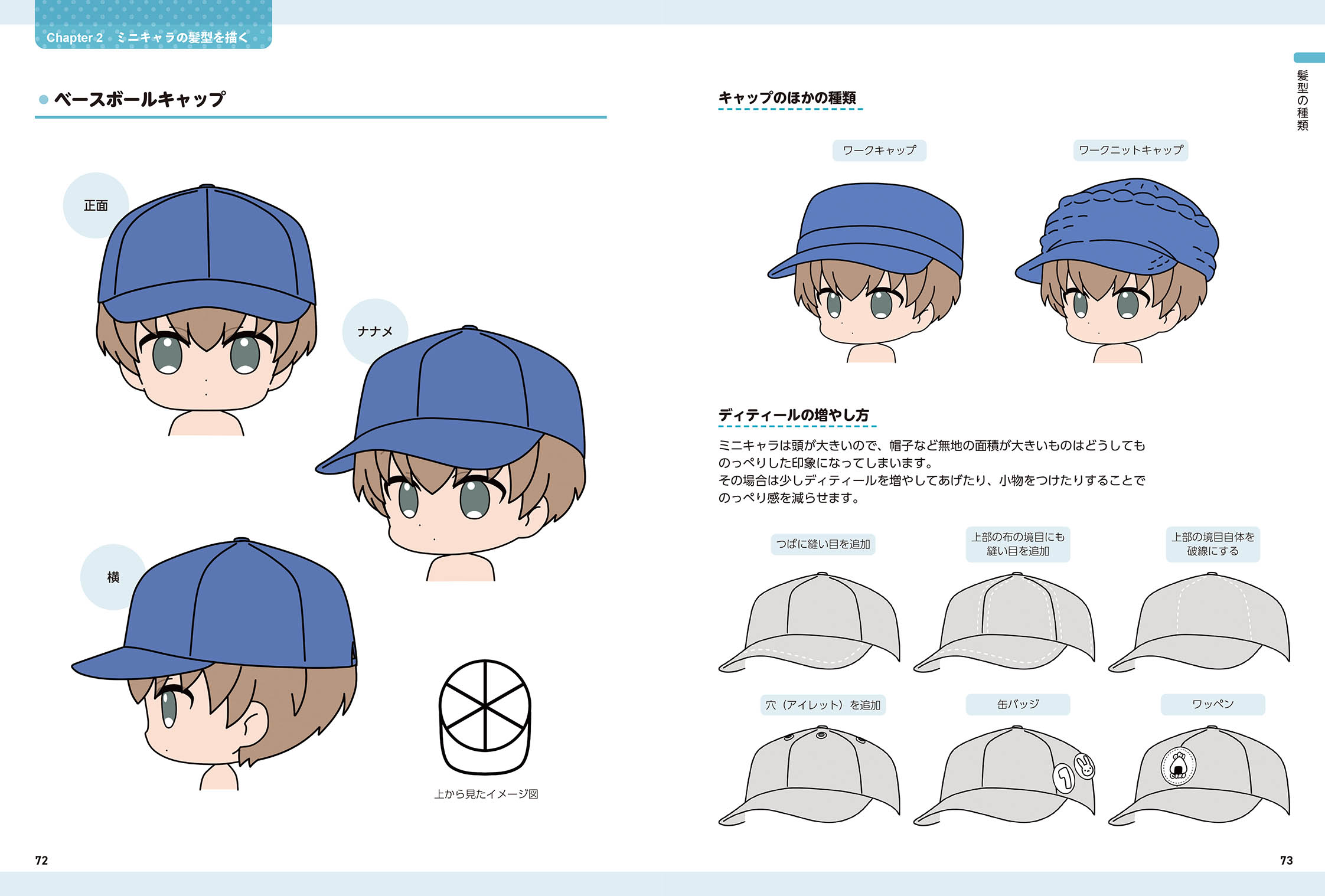 前髪をアレンジしたもの帽子を被ったものなど、さまざまなパターンを収録しています。