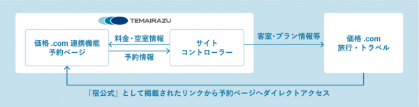 今回のシステム連携により、TEMAIRAZUを利用している宿泊施設は、オプション機能で提供する「価格.com連携機能」を利用することで、『価格.com 旅行・トラベル』に「宿公式」として宿泊プランを登録でき、他の宿泊予約サイトと並んで料金・空室情報が表示されるようになります。そこから予約ページへのダイレクトアクセスが可能な為、宿泊施設は登録する宿泊プラン料金をアピールして、流入促進、直接予約の増加が期待でき、収益の最大化を図ることができます。