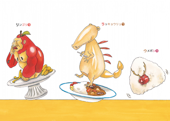 しりとりの楽しさ+「たべもの」と「どうぶつ」が合体して、この世に存在しない謎のいきものが現れるのです。