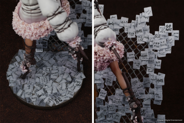 台座は廃墟となったマンションがモチーフとなっており、フェンスと床には誹謗中傷が書かれた付箋が散りばめられている。
