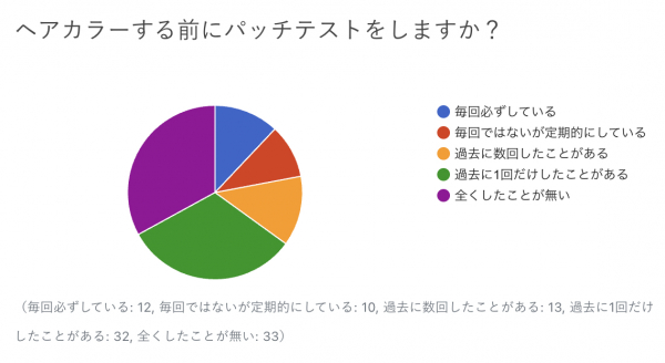 「ヘアカラーする前にパッチテストをしますか?」のアンケート調査では、“毎回必ずしている”が12%となり、逆に“全くしたことが無い”は33%という結果でした。