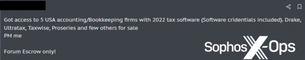 上の図はSophos X-Opsが発見したダークウェブフォーラムに投稿されたサンプルです。米国の小規模な会計事務所へのアクセス情報を宣伝しています。中小企業を標的としたサイバー犯罪フォーラム広告の業種別、国別の他の例も、2024年版ソフォス脅威レポートで参照できます。