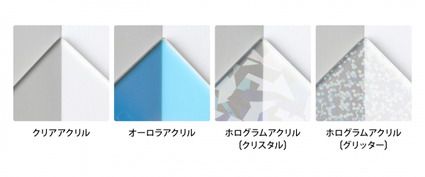 アクリルの素材は、スタンダードなクリア素材、見る角度で色が変わるオーロラ素材、キラキラと輝くホログラム素材からお選びいただけます。ホログラム素材はクリスタルとグリッターの2種類あります。