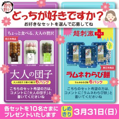 (2)キャンペーン期間中に「どっちが好きですか?」キャンペーンの投稿に、希望する賞品が「大人の団子」の場合はリポスト、「ラムネわらび餅」の場合はいいね。。