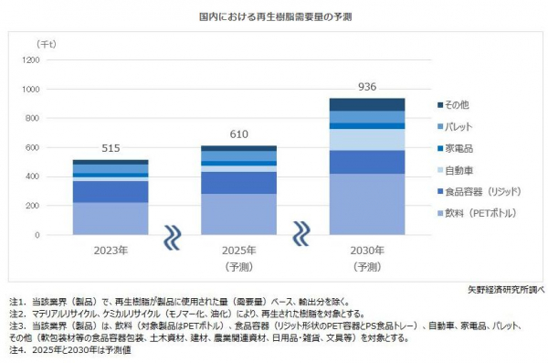 また、2030年頃までには、多くの化学メーカーやリサイクラー(再資源化業者やリサイクル樹脂メーカー)、コンパウンダー等でマテリアルリサイクルの高度化やケミカルリサイクルの実装化などが行われることからも、高品質な再生樹脂の供給量増加が見込まれ、ますますプラスチックリサイクルは活発化していく見通しである。2030年の再生樹脂需要量は93万6,000tになると予測する。