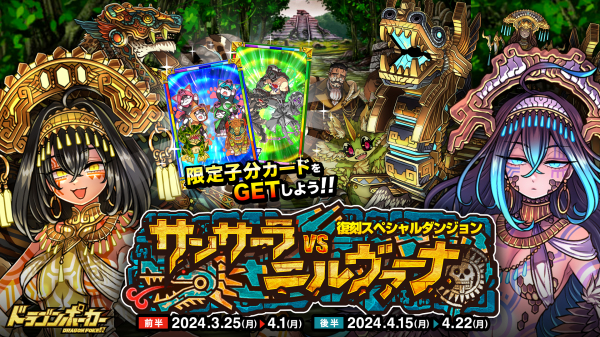 株式会社アソビズム(本社:東京都千代田区、代表取締役:大手智之)は、App Store・Google Playにて好評配信中のリアルタイム合体カードバトル『ドラゴンポーカー』で、2024年3月25日(月)より復刻スペシャルダンジョン「サンサーラvsニルヴァーナ」を開催いたします。