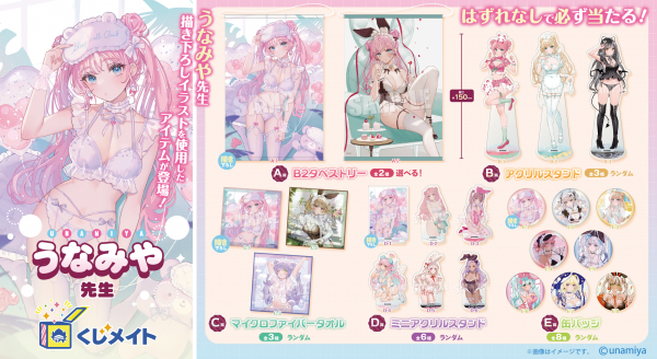 アニメイト通販の「くじメイト」に、大人気イラストレーター『うなみや先生』のオンラインくじが登場です。景品デザインには今回の「くじメイト」のために、うなみや先生に描き下ろしていただいた新規イラストも登場!その他、美麗カラーイラストも多数使用しました。