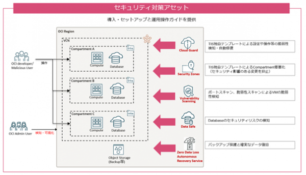 今回追加するセキュリティ対策アセットメニューは、Oracle Cloud Infrastructure(以下:OCI)運用における設定や作業およびDatabase等の脆弱性をチェックし、可視化・予防対処を行うことができます。OCIのセキュリティサービスであるOracle Cloud GuardやOracle Security Zones、Oracle Data Safe、Zero Data Loss Autonomous Recovery Service等を活用し、企業のミッションクリティカルシステムのOCIでの稼働を想定したTIS独自の設定や運用ガイドを提供します。