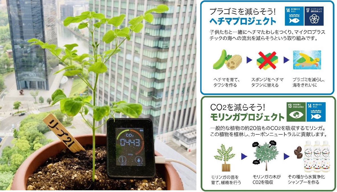 (1)「植林カーボンニュートラルプロジェクト」:室内にCO2吸収量の多い植物を設置