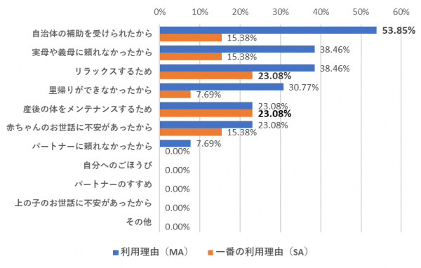 さらに利用者へ「産後ケアホテルを利用した理由」と「産後ケアホテルを利用した一番の理由」をそれぞれ聞いた。その結果、「産後ケアホテルを利用した理由」は「自治体の補助を受けられたから(53.85%)」「実母や義母に頼れなかったから(38.46%)」「リラックスするため(38.46%)」が主な理由として挙げられ、なかでも「自治体の補助」は利用を大きく後押ししていることがわかった(図3)。