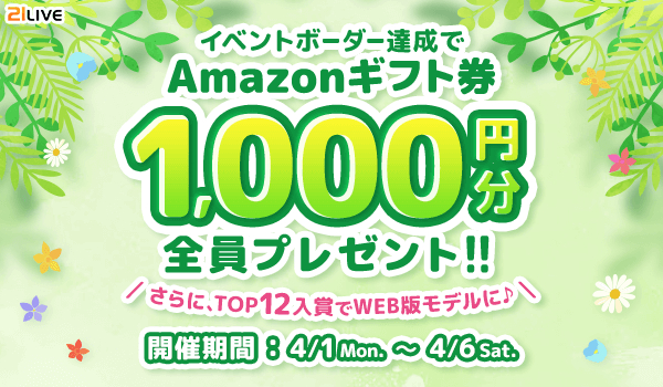 株式会社エムアンドティーティー(本社:沖縄県北谷町、代表取締役:井藤 三知子)が運営するエンターテイメント・ライブ配信アプリ【21LIVE(ニーイチライブ)】URL: https://21.live では、4月1日(月)より春のランキングイベントを開催。期間中に2万GOLDを獲得した全ライバーにAmazonギフト券を1,000円分プレゼントいたします。