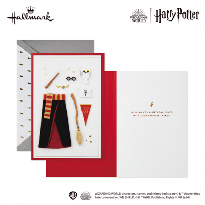 ローブとマフラー、ホウキ、フクロウのヘドウィグ、ハリーのメガネ、杖、金のスニッチ、ホグワーツの入学許可証などが 表紙に描かれたバースデーカードです。