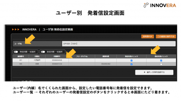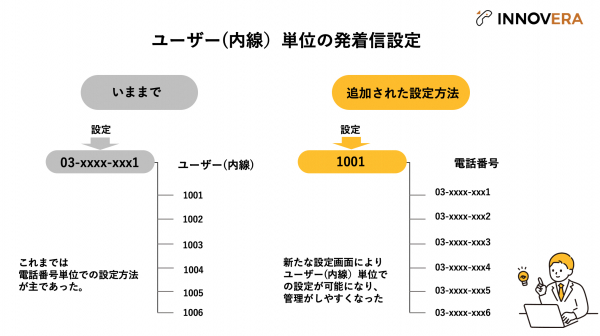 2024年3月28日、INNOVERAでユーザー(内線)毎に電話番号の発着信設定ができるようになり、ユーザビリティが向上しました。具体的には、「ユーザー別発着信設定画面」を追加されたことにより、これまで電話番号毎に発着信できるユーザーを設定していた方法に加え、ユーザー(内線)毎に一覧できる番号とともに設定が可能になることで、発着信できる番号がより一層管理しやすくなりました。