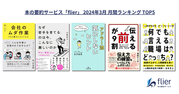 累計会員数114万人を突破した本の要約サービス「flier(フライヤー)」を運営する株式会社フライヤー(本社:東京都千代田区、代表取締役CEO 大賀康史)は、2024年3月のビジネス書月間ランキングを発表しました。