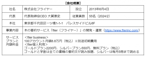 株式会社フライヤーは、本の要約サービス「flier(フライヤー)」を運営する、ITベンチャー(2013年6月設立)です。最大の特長は「書評(レビュー)」ではなく「要約」である点です。書き手の主観が入る書評とは異なり、著者の主張や論理(重要ポイントや全体像)を忠実にまとめ、読者に伝えます。書評でないため、出版社と著者から要約の許可を得る必要があり、要約した原稿にも目を通していただくことで、高品質なサービスを提供しています。
