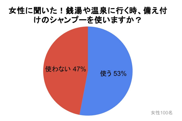 女性を対象に「銭湯や温泉に行く時、備え付けのシャンプーを使いますか?」のアンケート調査を行ったところ、『使う』が53%、『使わない』が47%となり、女性の約半数は備え付けのシャンプーを使わないことがわかりました。