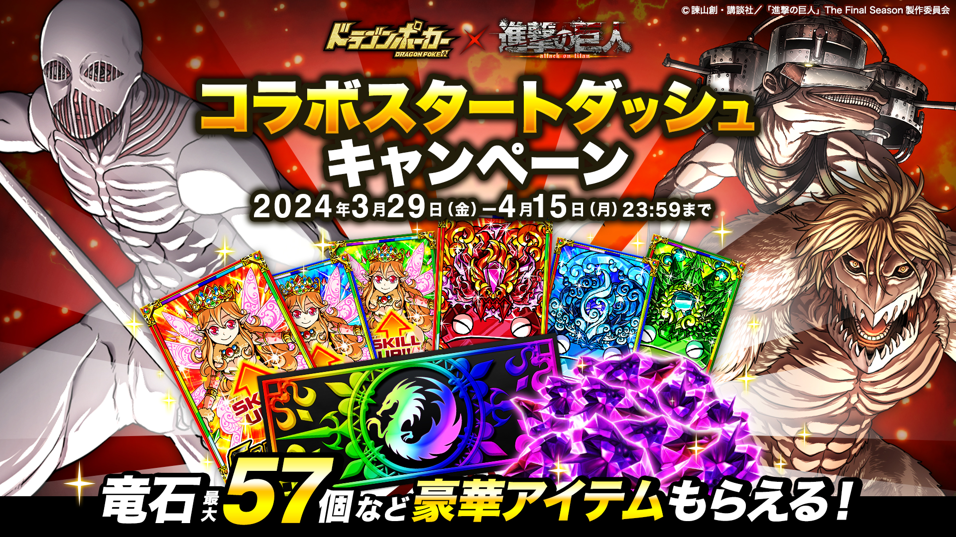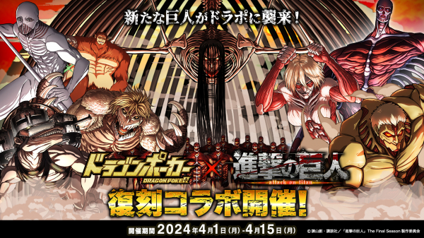 株式会社アソビズム(本社:東京都千代田区、代表取締役:大手智之)は、App Store・Google Playにて好評配信中の『ドラゴンポーカー』とTVアニメ『進撃の巨人』のコラボイベントを記念して「フォロー&リポストで参加!豪華報酬プレゼントキャンペーン」を、2024年3月29日(金)より実施することをお知らせいたします。