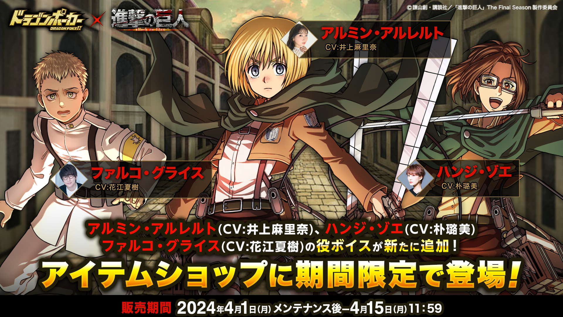 コラボ期間中の限定アイテムとして「エレン・イェーガー(CV:梶裕貴)」「ミカサ・アッカーマン(CV:石川由依)」「リヴァイ (CV:神谷浩史)」に加え、新たに「アルミン・アルレルト(CV:井上麻里奈)」「ハンジ・ゾエ(CV:朴璐美)」「ファルコ・グライス(CV:花江夏樹)」の役ボイスがアイテムショップに登場します。