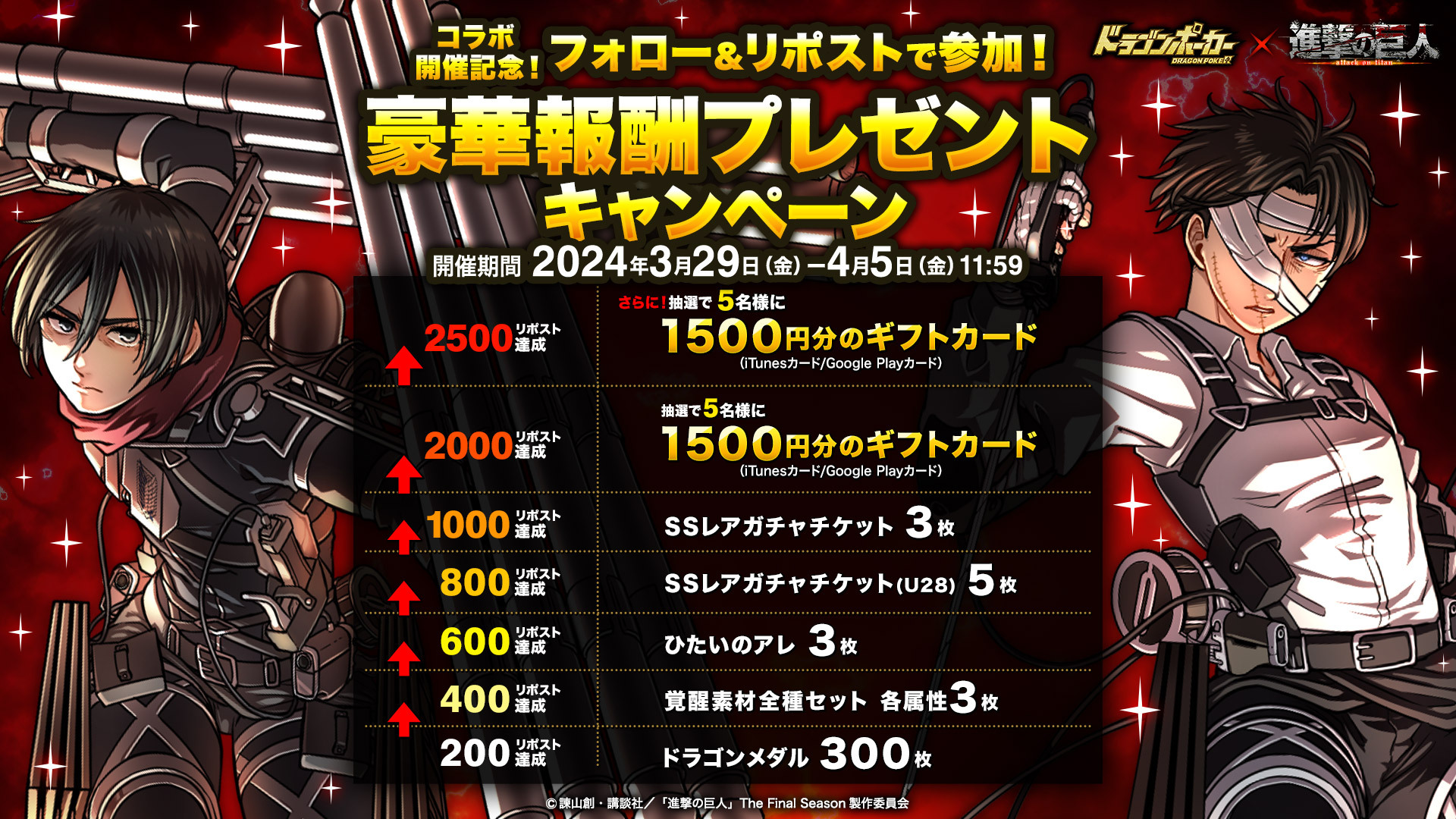 3月29日(金)より、TVアニメ『進撃の巨人』とのコラボイベントを記念して「フォロー&リポストで参加!豪華報酬プレゼントキャンペーン」を実施いたします。対象ポストのリポスト数に応じて豪華アイテムや、抽選でギフトカードをプレゼント!キャンペーンへのたくさんのご参加お待ちしています!