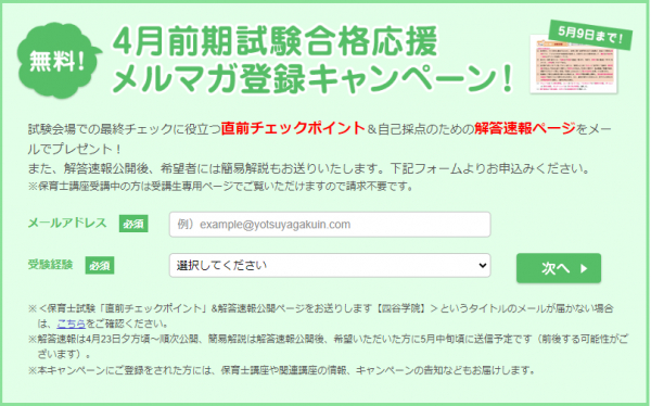 また、直前チェックポイントを請求してくださった方には、4月20日・21日に実施される保育士試験の解答速報ページにもご招待します。