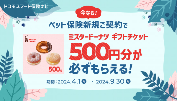 ■キャンペーン内容:期間中、ドコモスマート保険ナビでペット保険を新規にご契約されたお客さまにもれなく「ミスタードーナツ ギフトチケット(500円)」をプレゼントします。