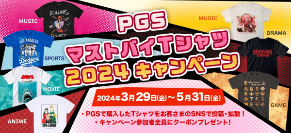 音楽、映画、ドラマ、スポーツ、アニメ、ゲームなど、日本最大のエンターテイメント公式グッズストア「PGS」を運営する株式会社JAMSHOPPINGは、PGSで購入したTシャツをSNSで投稿・拡散した参加者全員にクーポンをプレゼントする『PGS マストバイTシャツ2024キャンペーン』を3月29日(金)~5月31日(金)の日程で開催しております。