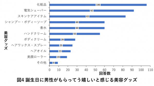 結果、フェイスパウダーやBBクリームを含む「化粧品」を選ばれる男性が多く、次に「電気シェーバー」を選ぶ男性が多くみられました。