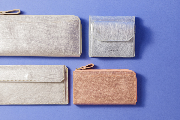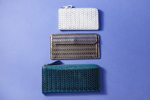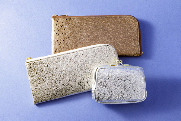 今回は、メタリックな風合いながら和紙のような質感の遊び心あふれるシリーズや、日本のバッグの起源でもある柳行李(柳を編んだ籠)をモチーフにエンボス加工、更に箔加工を施した奥深い表情のシリーズなどのお財布からバッグまで様々なレザーアイテムが揃いました。