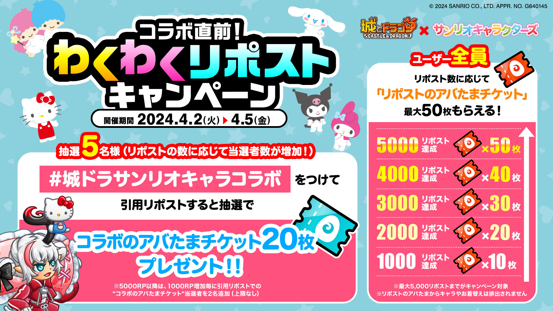 そしてハッシュタグ「#城ドラサンリオキャラコラボ」をつけて引用リポストされた方の中から抽選で5名様に、引用リポスト賞として「コラボのアバたまチケット」20枚をお贈りいたします!さらに5000リポスト以降は、1000リポスト増加毎に引用リポスト賞の当選者が2名追加されます!ぜひ引用リポストする際はハッシュタグとあわせて、「コラボイベントが発表された時の感想」や「コラボイベントの楽しみにしているポイント」などもコメントしてみてください!