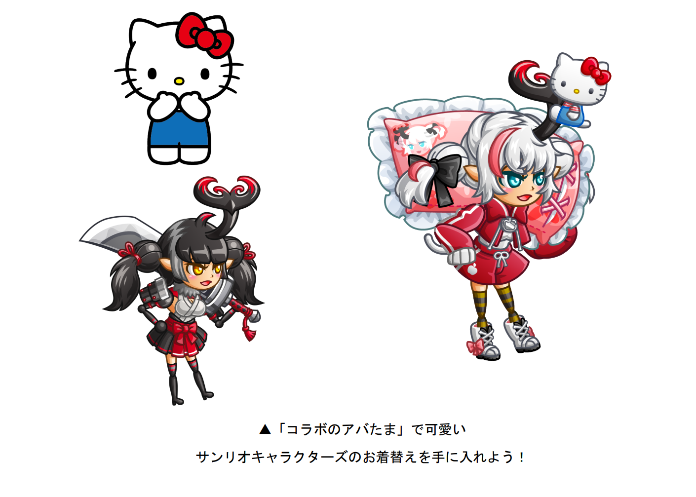 期間中、「コラボのアバたま」に「ハローキティ」「クロミ」「シナモロール」「リトルツインスターズ」をモチーフとした、コラボ限定の激レアお着替えが登場します。そのほか、レア城主イベントや襲来イベントなど、コラボ期間限定のイベントも実施いたしますので、4月5日(金)からのコラボ開催に是非ご参加ください。